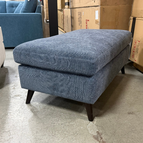 Its rectangular silhouette is supported by dark-finished tapered wooden legs, giving it a sophisticated mid-century modern lift that keeps your space feeling airy. Whether you’re pairing it with the matching Denim Chofa or using it as a standalone statement piece, its generous proportions make it perfect for holding a serving tray or providing a cozy spot to kick up your feet after a long day.