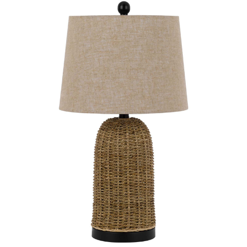 Topped with a round, light brown burlap fabric hardback shade, this lamp diffuses light into a soft, inviting glow that enhances the natural materials of the base. Built for durability and ease of use, it includes a simple on/off rotary switch and a 6-foot black cord. Whether styled as a pair of bedside lamps or used as a standalone accent on a living room console, the Indio lamp adds a layer of "carefree casual" comfort to your home.