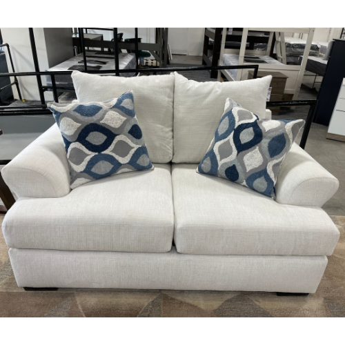 Designed for long-lasting use, this loveseat features a sturdy hardwood frame and sinuous spring support. The look is elevated by two premium throw pillows with a textured blue and charcoal geometric pattern that adds a pop of cool-toned color. Whether placed in a small apartment or as part of a larger living room set, this loveseat provides a versatile, "carefree casual" aesthetic that matches perfectly with the matching oversized chair and tufted ottoman.