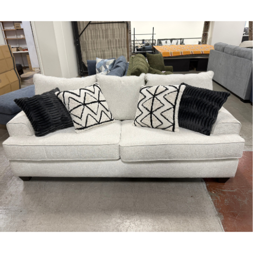 The sofa features track arms with a subtle flare and thick, plush back cushions that invite you to sink in. To add depth and character, it comes complete with four designer accent pillows: two featuring a plush, textured black ribbing and two with a bold, geometric tribal pattern. Whether your style is coastal, farmhouse, or strictly modern, this sofa serves as the perfect neutral anchor.