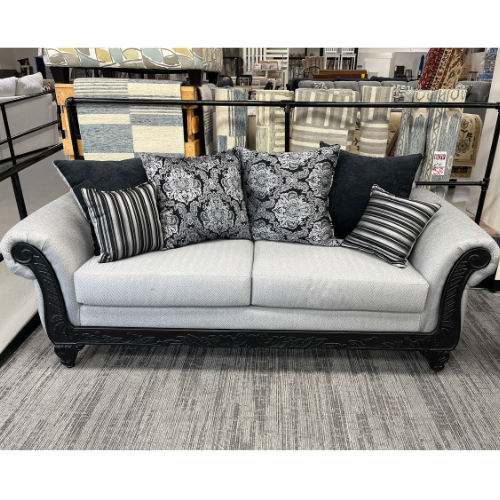 The Madonna Sofa is the pinnacle of the Madonna collection, designed to be the focal point of any formal or upscale living room. It features a stunning, solid wood frame finished in a deep ebony black, intricately hand-carved with scrolls and floral motifs that wrap from the curved arms across the entire base. This dark, textured woodwork provides a dramatic foundation for the soft, silver-gray fabric body.
