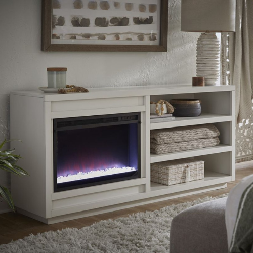 Elevate your home entertainment experience with the aspenhome Perry Fireplace Console. Part of the celebrated Perry collection, this console is designed to be a "haven" in the modern home, offering a handcrafted appeal that fits today's lifestyle. The crisp white finish is beautifully accented by custom champagne-pull hardware, creating a look that is both fresh and timeless.