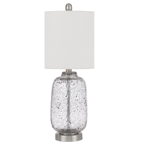 The Solaro Collection Table Lamp is a masterclass in modern glasswork, designed to catch the light even when turned off. The center of the lamp features a beautifully textured, distressed bubble glass body that provides a unique, handcrafted look. This ethereal glass core is framed by sleek Brushed Steel metal components, offering a cool-toned, industrial-chic contrast that anchors the design.
