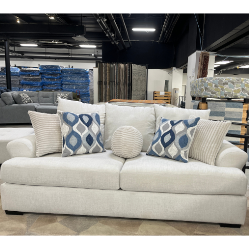 This sofa is distinguished by its curated collection of high-end accessories. It features two large corduroy-textured side pillows, two premium tapestry pillows in a navy and gray teardrop pattern, and a charming round "globe" accent pillow. Built with a reinforced hardwood frame and high-density foam, this sofa is designed to maintain its shape and comfort through years of movie nights and afternoon naps.